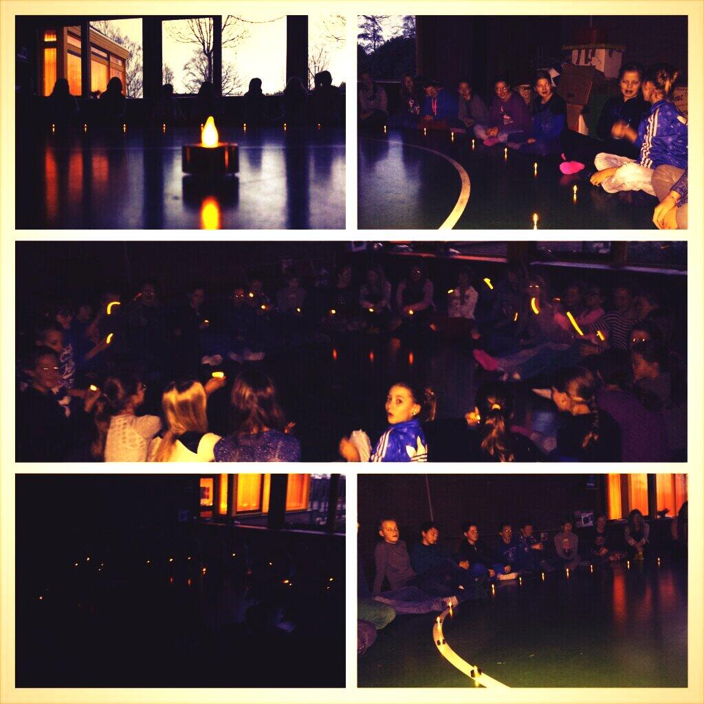 Afgelopen januari had ik het volgende bedacht. Ik gaf alle kinderen een waxinelichtje (zo'n elektrische) en we verzamelden in het speellokaal. Iedereen deed de schoenen uit en we gingen in een grote kring zitten. Het was buiten nog schemerig en dat zorgde voor een intieme sfeer. We hadden elkaar 2 weken niet gezien. Er viel dus genoeg te vertellen. Hoe ga je dat doen met 30 kinderen. Per persoon 3 minuten vertellen is niet veel, maar dan ben je 1,5 uur verder. Ik wilde wel dat ze wat van elkaar te weten kwamen. Oog en oor voor elkaar. Ik had van te voren vragen bedacht de ik wilde stellen. De kaarsjes bleven op de grond staan en iedereen ging achter zijn kaars staan en nog een grote pas achterwaarts. Het vragenvuur kon beginnen. Zet een stap voorwaarts als je de vraag kun beantwoorden. Jij als leerkracht kunt dan zelf bepalen bij welke vraag je bij welk kind kunt doorvragen.